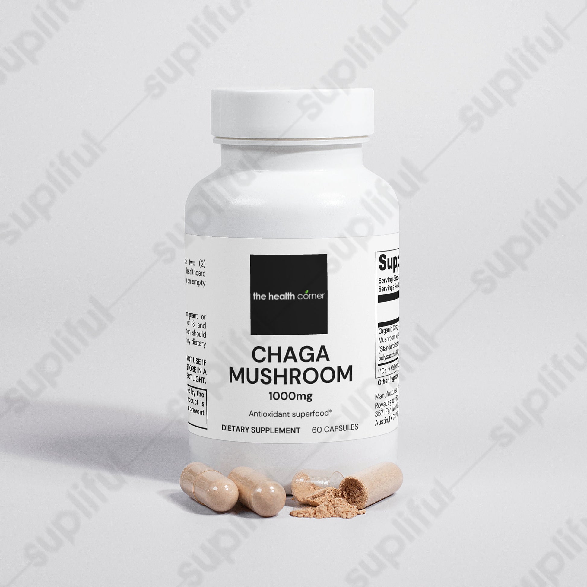 Ingredients: Organic Chaga (Inonotus obliquus) Mushroom Mycelium Powder (Standardized to 40% polysaccharides [400mg]), Organic capsule (pullulan, water), silica.
